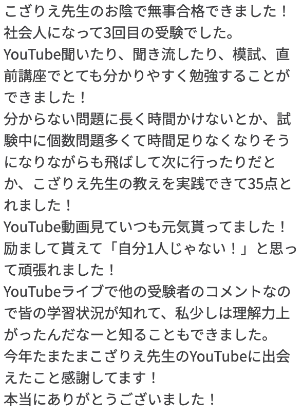 YouTubeの動画のみを活用し、独学で合格を掴み取ったというお声も多数いただきました。